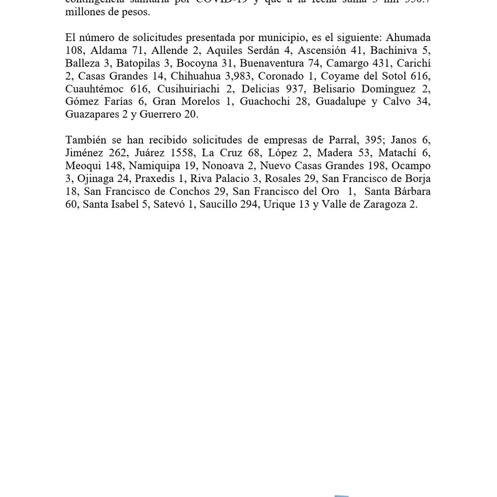 También se han recibido solicitudes de empresas de Parral, 395; Janos 6, Jiménez 262, Juárez 1558, La Cruz 68, López 2, Madera 53, Matachí 6, Meoqui 148, Namiquipa 19, Nonoava 2, Nuevo Casas Grandes 198, Ocampo 3, Ojinaga 24, Praxedis 1, Riva Palacio 3, Rosales 29, San Francisco de Borja 18, San Francisco de Conchos 29, San Francisco del Oro 1, Santa Bárbara 60, Santa Isabel 5, Satevó 1, Saucillo 294, Urique 13 y Valle de Zaragoza 2.